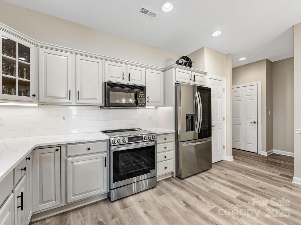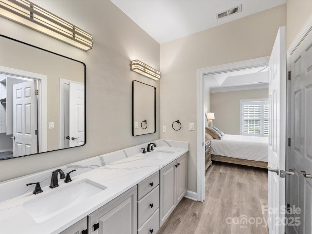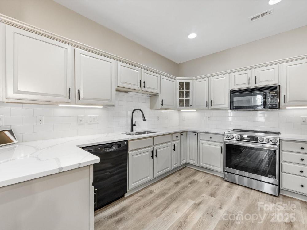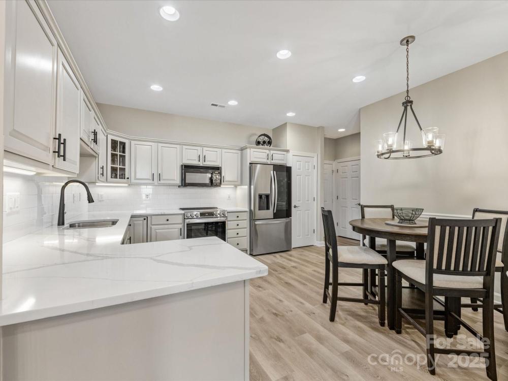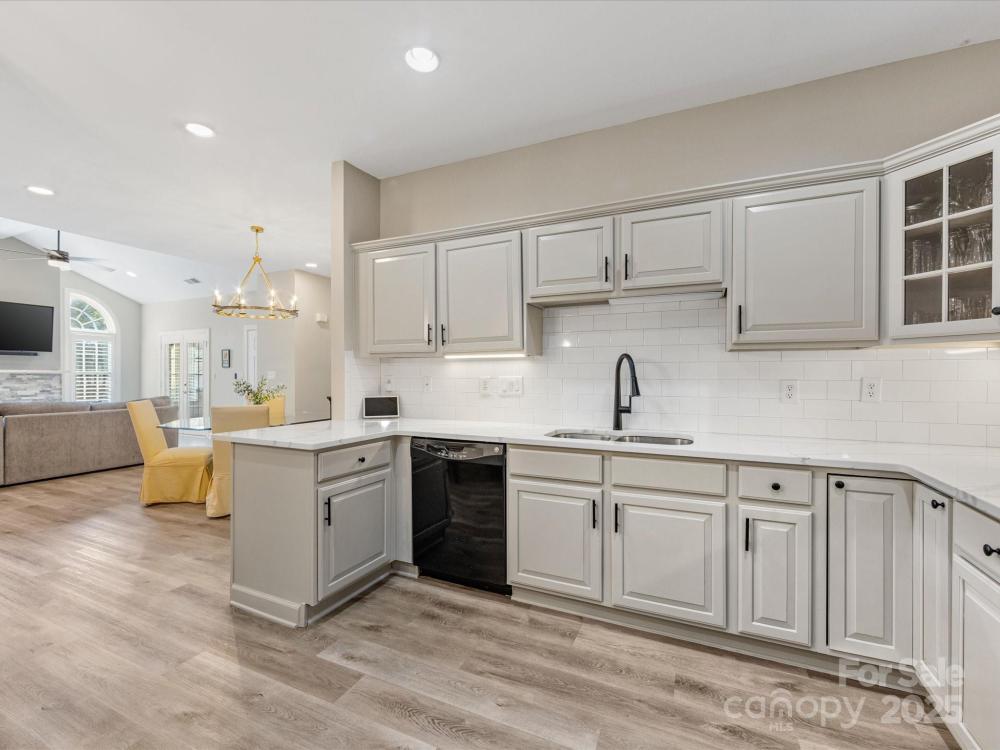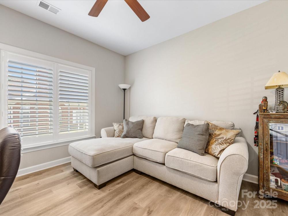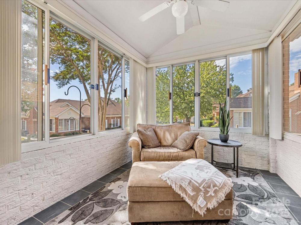Renovated from top to bottom! This beautifully updated 2 bedroom + office/3rd bedroom, one-level home in highly desirable Windsor Oaks offers the perfect blend of style, comfort, and low-maintenance living. Set on a quiet corner lot, this home features an open floor plan with vaulted ceilings, a cozy gas fireplace with a brand-new surround, and expansive windows that bathe the living area with natural light. The newly updated sunroom, featuring new tile flooring, provides a bright and inviting space for morning coffee, reading, or year-round relaxation. The kitchen has been completely refreshed with sleek quartz countertops, updated cabinetry and hardware, stainless steel appliances, and ample storage. The primary suite is a true retreat, boasting a tray ceiling, a large walk-in closet, and a stunningly renovated ensuite bath with modern finishes. The second bedroom is situated across from an updated guest bath, while a flex/office room provides versatile options for work or guests. Other recent upgrades include new flooring throughout, designer lighting, and custom "plantation" shutters —making this home feel brand new. Enjoy the ease of Windsor Oaks living, where HOA dues cover exterior maintenance, landscaping, water/sewer, and trash removal. Community amenities include a clubhouse, pool, and fitness center—all just minutes from Stonecrest, Blakeney, Waverly, and the Bowl at Ballantyne, with easy access to I-485 and top-rated schools. Washer, dryer, and refrigerator remain, making this beautiful home truly move-in ready. If you’re looking for privacy, convenience, and modern style in one of South Charlotte’s most sought-after communities—this is it. Welcome home!