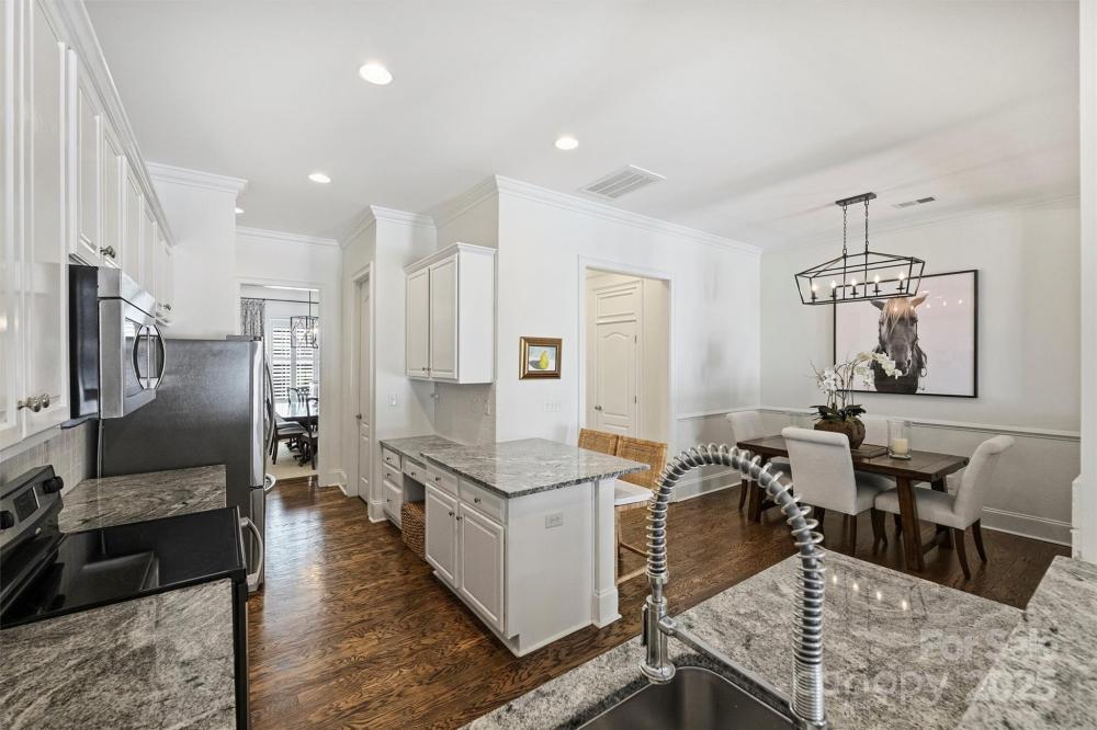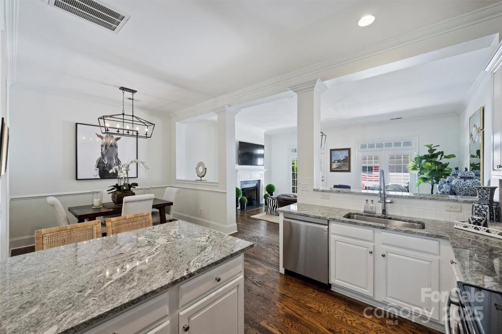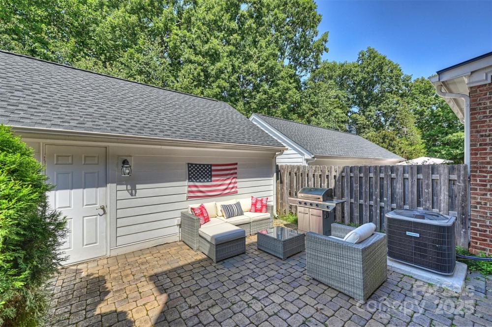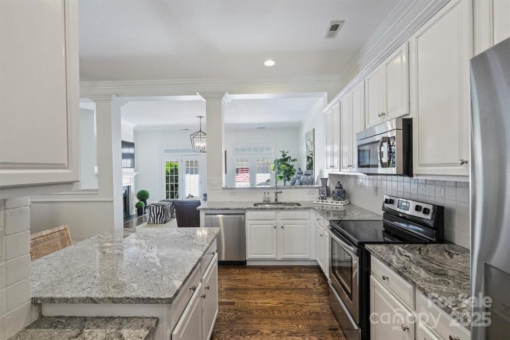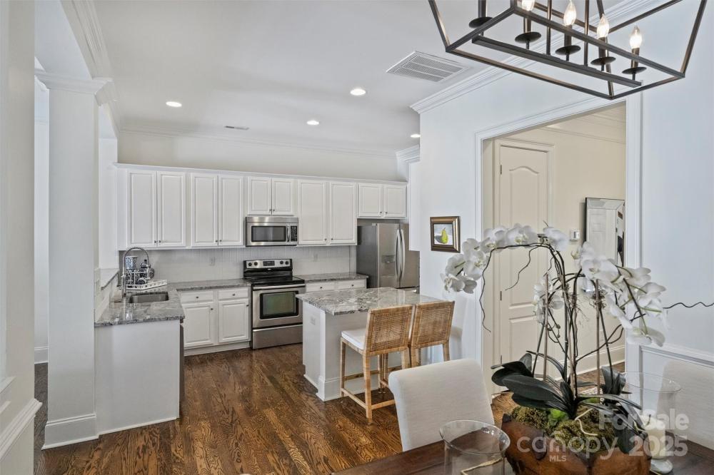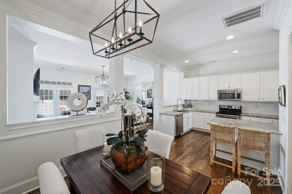 Welcome to this charming Charleston style townhome conveniently located across from Stonecrest Shopping Center and minutes from the new Bowl at Ballantyne entertainment development. This full brick townhome features an open floor plan enhanced by tall 10ft main floor ceilings that flood the home with natural light. The kitchen includes updated cabinet finishes, stainless steel appliances, granite countertops and a walk in pantry. A spacious living room features a gas fireplace and leads to a private, fenced-in patio—ideal for outdoor entertaining. Upstairs you will find three generous sized bedrooms, neutral paint and carpet, and a large laundry room. You will feel like you are in a model home with the extensive multi-piece trim work, refinished hardwood floors, neutral paint and carpet, and updated fixtures throughout. Behind the rear patio is a private two car detached garage that includes a secondary attic space above for storage. Located just walking distance from a vast amount of shopping, dining, and entertainment, this home offers both tranquility and convenience that is very difficult to find.