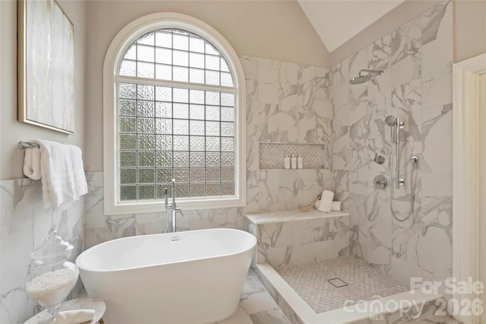 Upstairs, the luxurious primary suite offers a tray ceiling, new carpet, and an updated spa-like bath (2026) with soaking tub, frameless shower, new fixtures, and Bianco Rhino natural stone countertops. Three additional spacious bedrooms (all with new carpet, 2026), two baths, plus a large bonus room with custom built-ins provide ample space and flexibility.