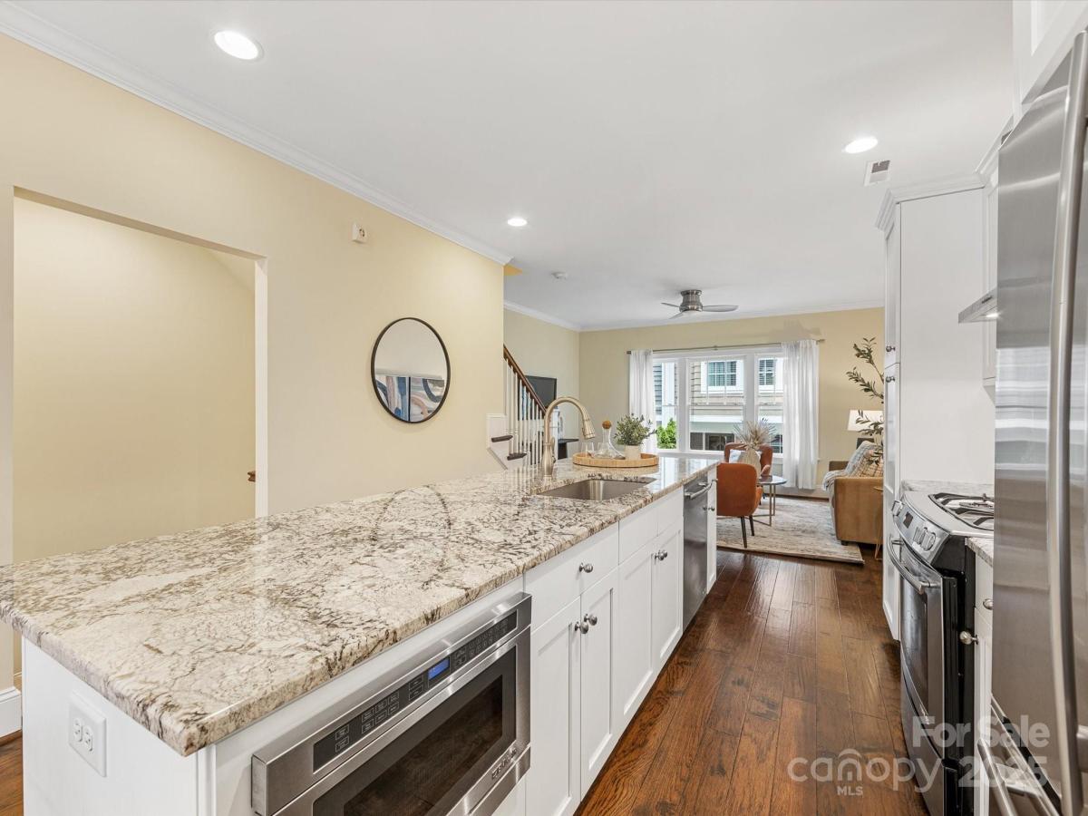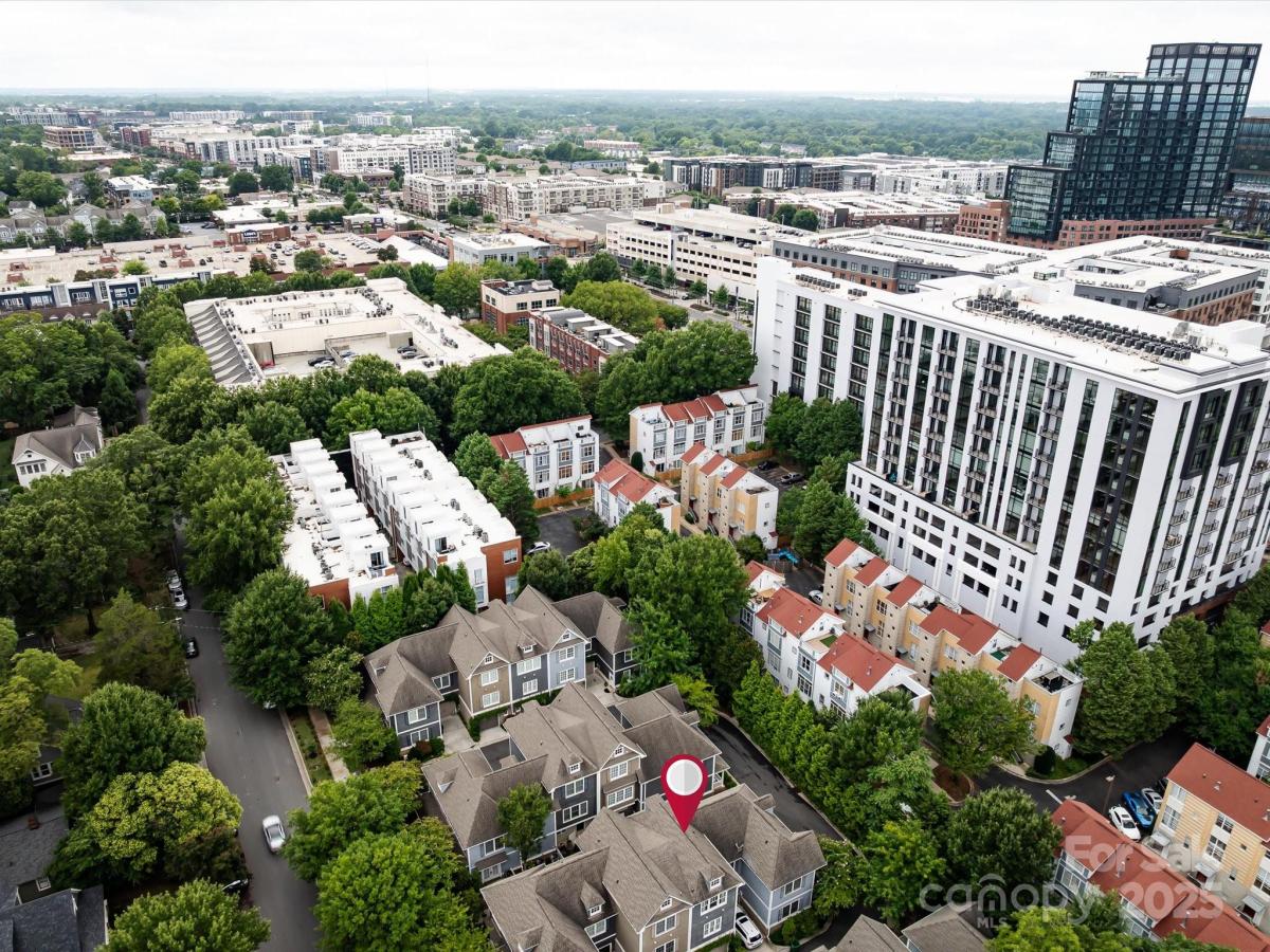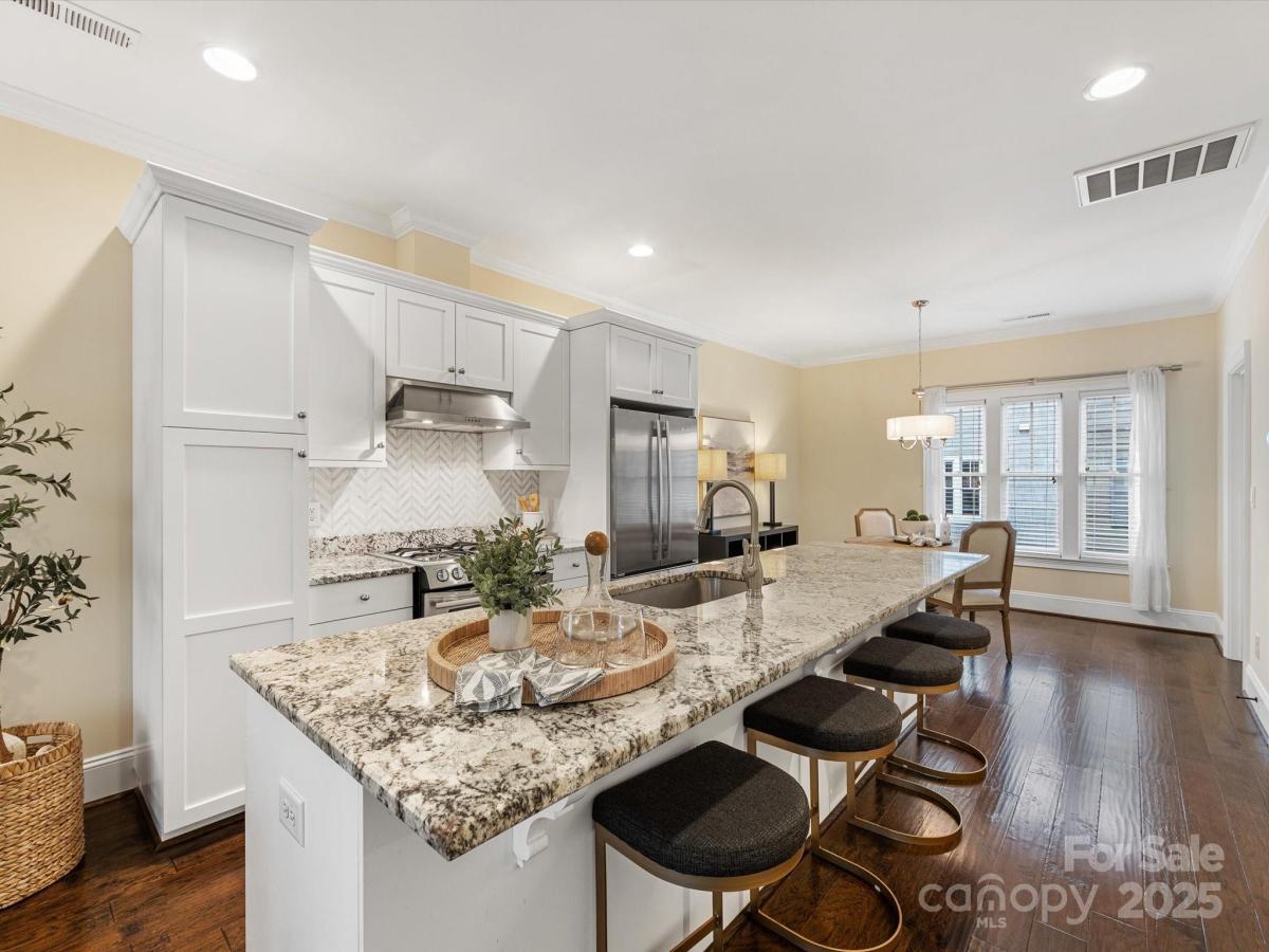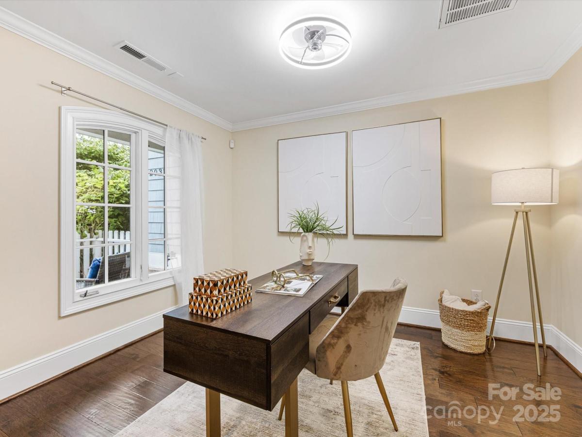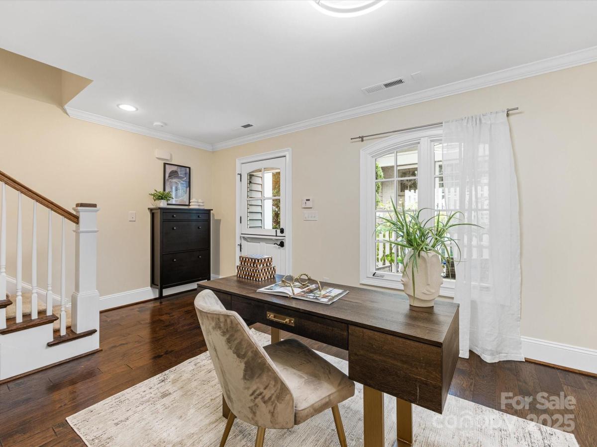 Live in the heart of historic Dilworth with close proximity to shops, restaurants and parks in Dilworth and SouthEnd. This three-story townhome allows for flexibility with an option for working from home, privacy with two split bedrooms on the upper level and the convenience of being located in such a prime location. Enter down a quaint walkway to a charming gated front patio with a charming dutch door entry. A main level office/flex space allows quiet work from home options or another place to gather. Head up one level to an open main living area that includes a chef's kitchen with gas ranch, granite counters, a chevron tiled backsplash, and with cabinetry with large center island. A dining area and living room are on either side and have large windows allowing for tons of natural light. Beautiful hardwood floors on the main and upper level. Upstairs you'll find a spacious primary suite with two closets, dual vanity, added storage and an oversized walk-in shower. Second bedroom also includes an ensuite. Laundry is conveniently located on third floor. The garage is accessed by the rear alley and is a rare find in Dilworth- such a nice added bonus. It includes shelving, a storage niche and large storage closet. Don't miss this rare opportunity for a prime Dilworth location with many upgraded features inside.