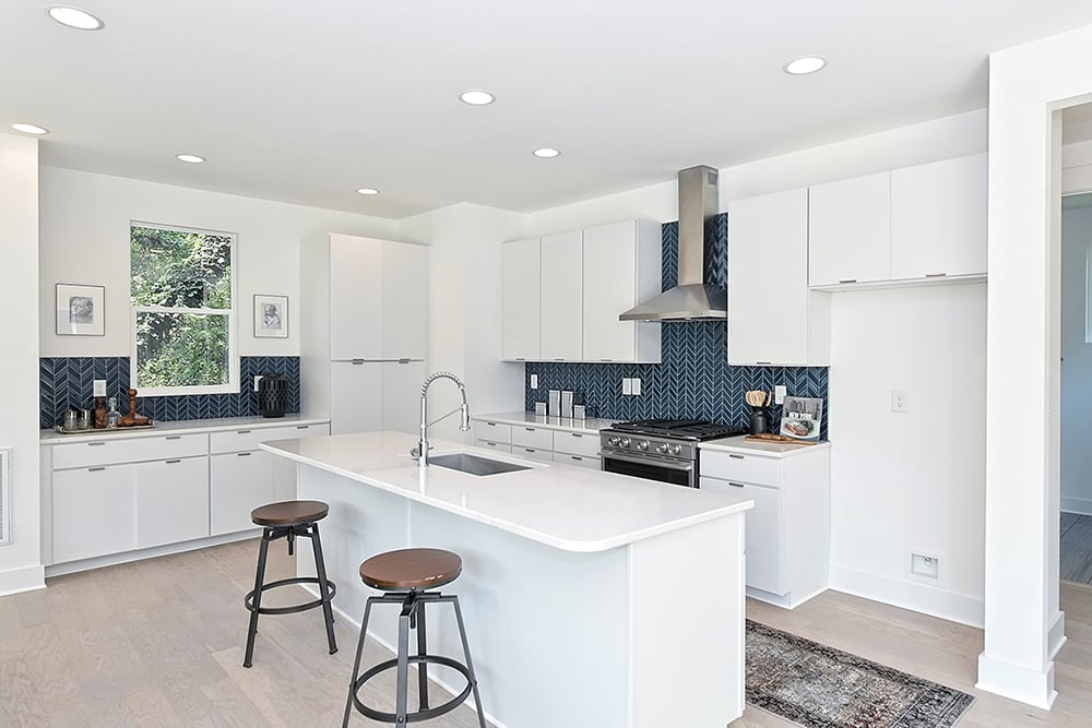 Herringbone blue glass kitchen backsplash, Carrera-look quartz countertops in kitchen and baths.