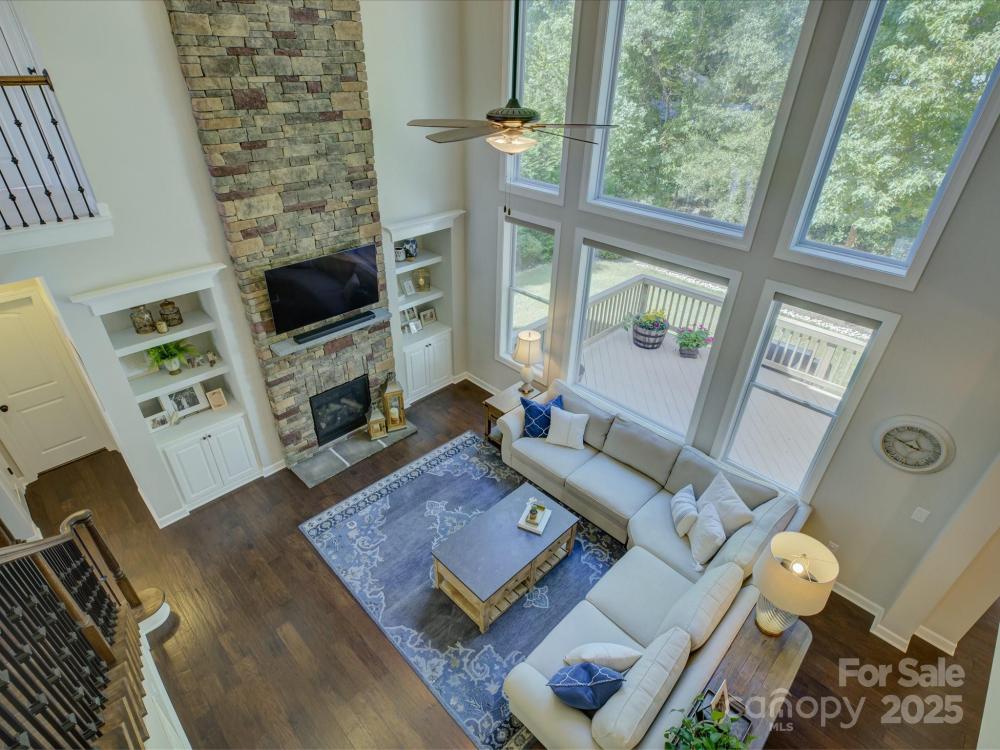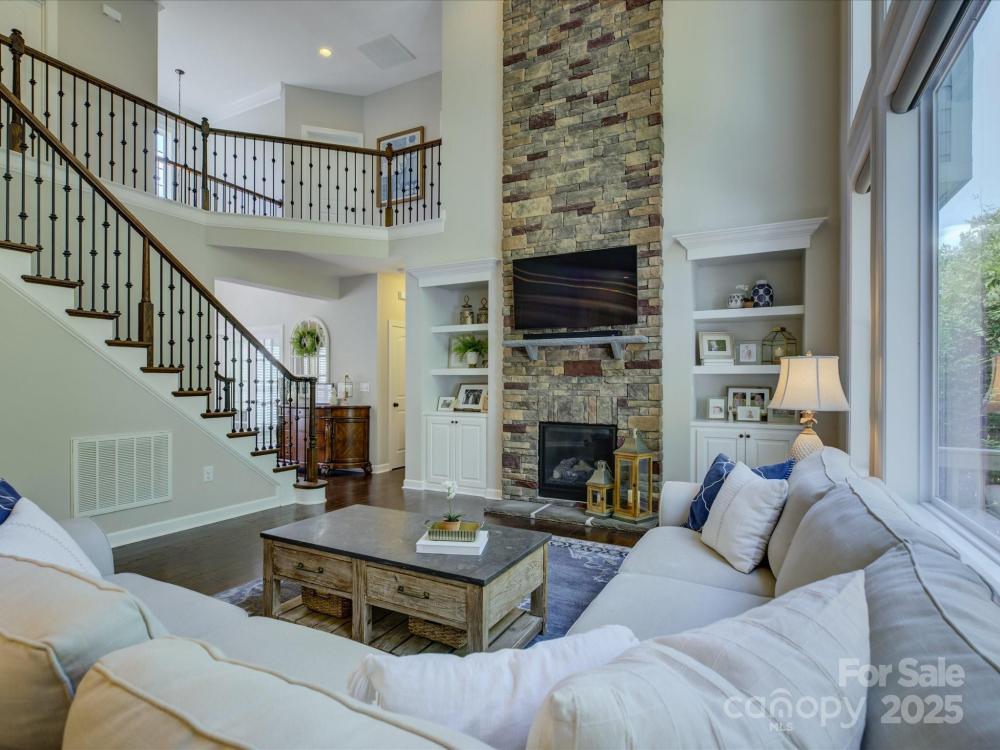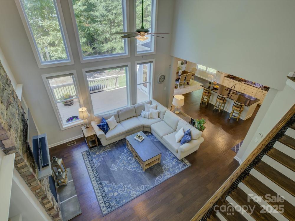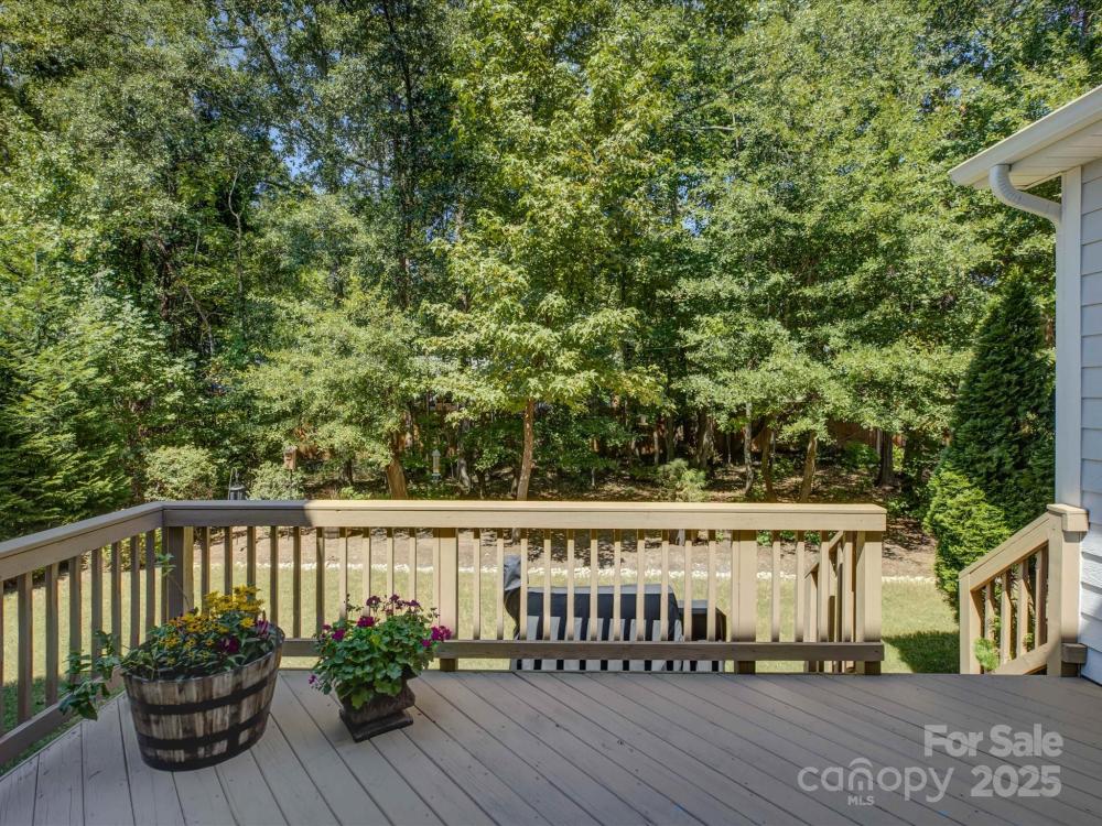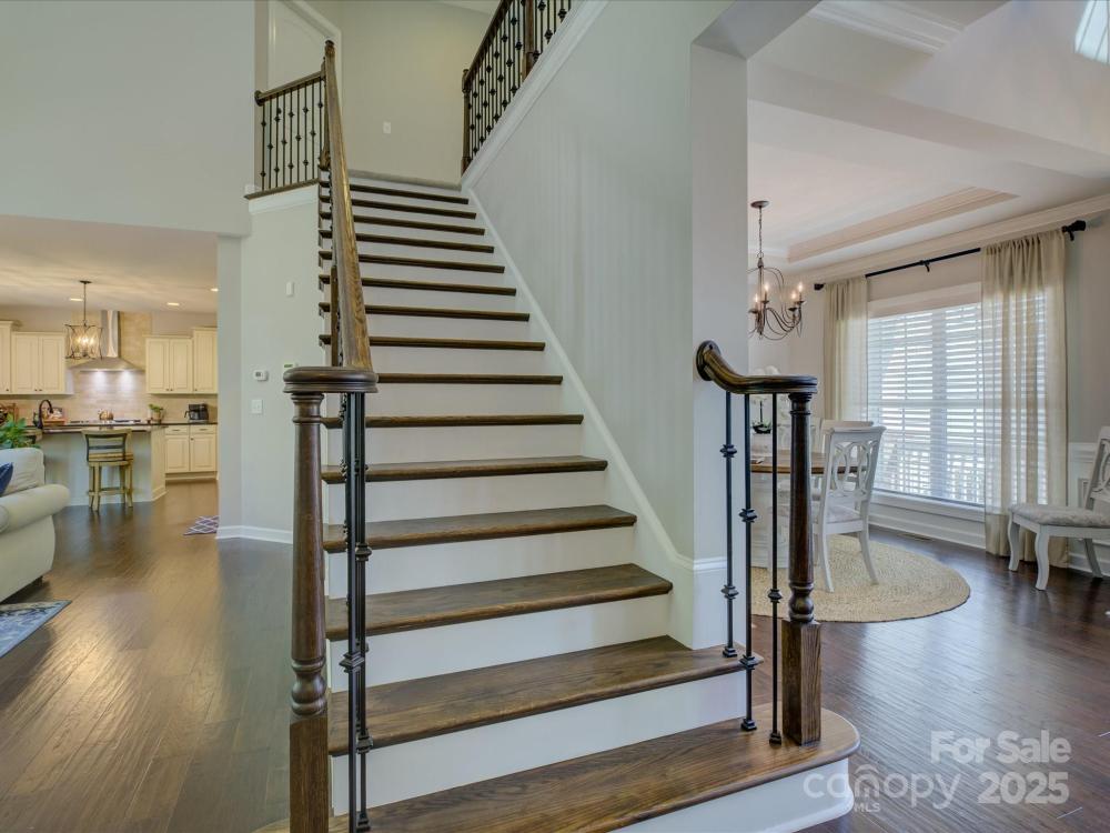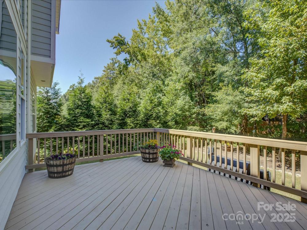 Beautiful cul-de-sac home located in the amenity-rich Palisades. The inviting rocking chair front porch welcomes you home, leading into a light-filled two-story foyer with a formal dining room on one side and a quiet, private French door office on the other. The elegant dining room, accented with a tray ceiling and wainscoting, offers the perfect setting for gatherings both casual and formal. The great room is drenched in natural light from the two-story windows and warmed by the stacked stone floor-to-ceiling fireplace. The gourmet kitchen features ample cream cabinetry, accented with granite countertops, an oversized prep island with room for bar seating, a gas cooktop accompanied by a stainless steel exhaust hood, a corner pantry, and a wall oven. The breakfast area opens onto an expansive deck overlooking a private wooded yard—a guest bedroom with a full bath on the main floor. Upstairs, the Primary suite includes a tray ceiling, a glass-enclosed shower, a soaking tub, a dual corner vanity, and a his & hers walk-in closet. The bonus room is perfect for entertainment or relaxation. It includes a closet and could be a 5th bedroom if needed. Spacious bedrooms 3 & 4 share a hall bath. A three-car garage provides plenty of space for vehicles, storage, or hobbies. This home has everything you're looking for in a country club-style community.