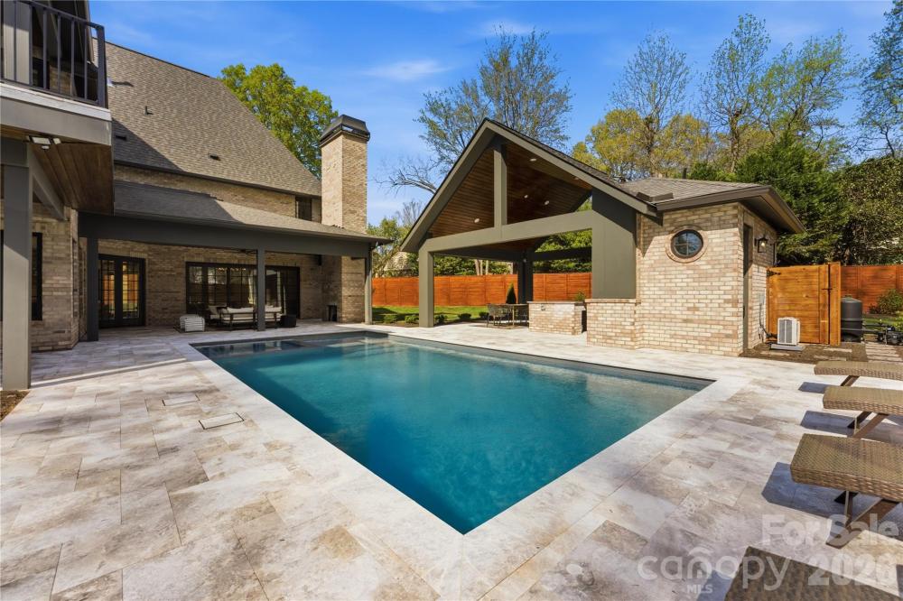 Welcome to 154 N Canterbury Rd, a showstopping luxury estate by Maverick Building that seamlessly blends elevated design, thoughtful functionality, and resort-style living in the heart of Cotswold. This exceptional 6 bedroom, 7.5 bath new construction home was designed for both everyday comfort and unforgettable entertaining. The outdoor living experience is truly unmatched, featuring a stunning pool and hot tub, a fully equipped pool cabana with a kitchen and oversized island, a full outdoor bath with changing area, and an outdoor shower. Three covered porches surround the pool, creating a private oasis complemented by expansive yard space ideal for recreation or relaxation surrounding the outdoor living spaces. Inside, the home continues to impress with curated designer finishes and refined architectural details throughout. The grand living room showcases 11-foot ceilings with exposed wood beams and a striking cast stone fireplace, while the walk-in wine room is complete with a steel frame entry door and custom cabinetry which provides a sophisticated focal point for entertaining. The primary suite is a true retreat, designed to feel like a luxury resort. Enjoy a private covered terrace looking at the pool, a spacious sitting area, and a custom coffee and wine bar. This primary suite also features a large walk-in shower, a soaking tub and an extraordinary custom closet with inset lighting, glass front cabinetry, soft close drawers, and a Taj Mahal quartzite waterfall island. A junior primary suite on the main level offers the perfect private space for guests, complete with a soaking tub and dual vanities. Upstairs, the bonus room provides incredible flexibility with built in seating, a large open layout, wet bar, and full bath that makes it ideal for a media room, lounge, or guest retreat. Every inch of this home reflects intentional design. The lighting, custom cabinetry, flooring, color palette, and wallpaper selections creating a cohesive and elevated aesthetic throughout. Situated on one of Cotswold’s most sought after and walkable streets, surrounded by high-end new construction and estate homes, this prime location offers convenient access to SouthPark, Uptown, private schools, shopping, dining, and everything that makes this area so desirable.