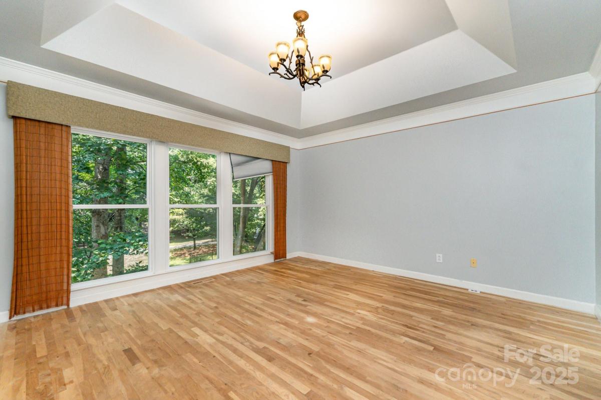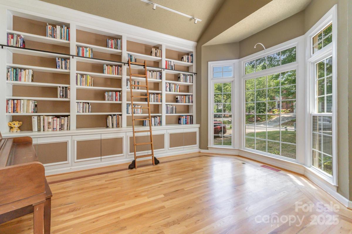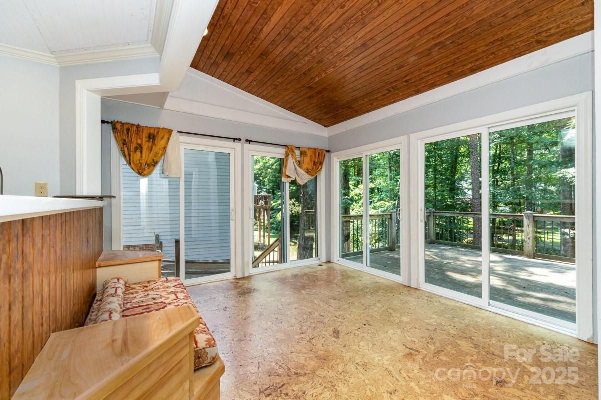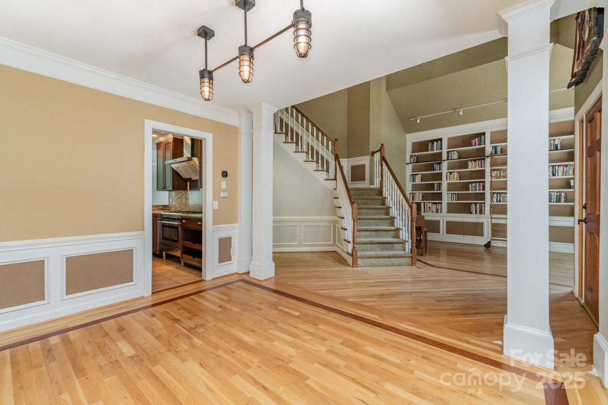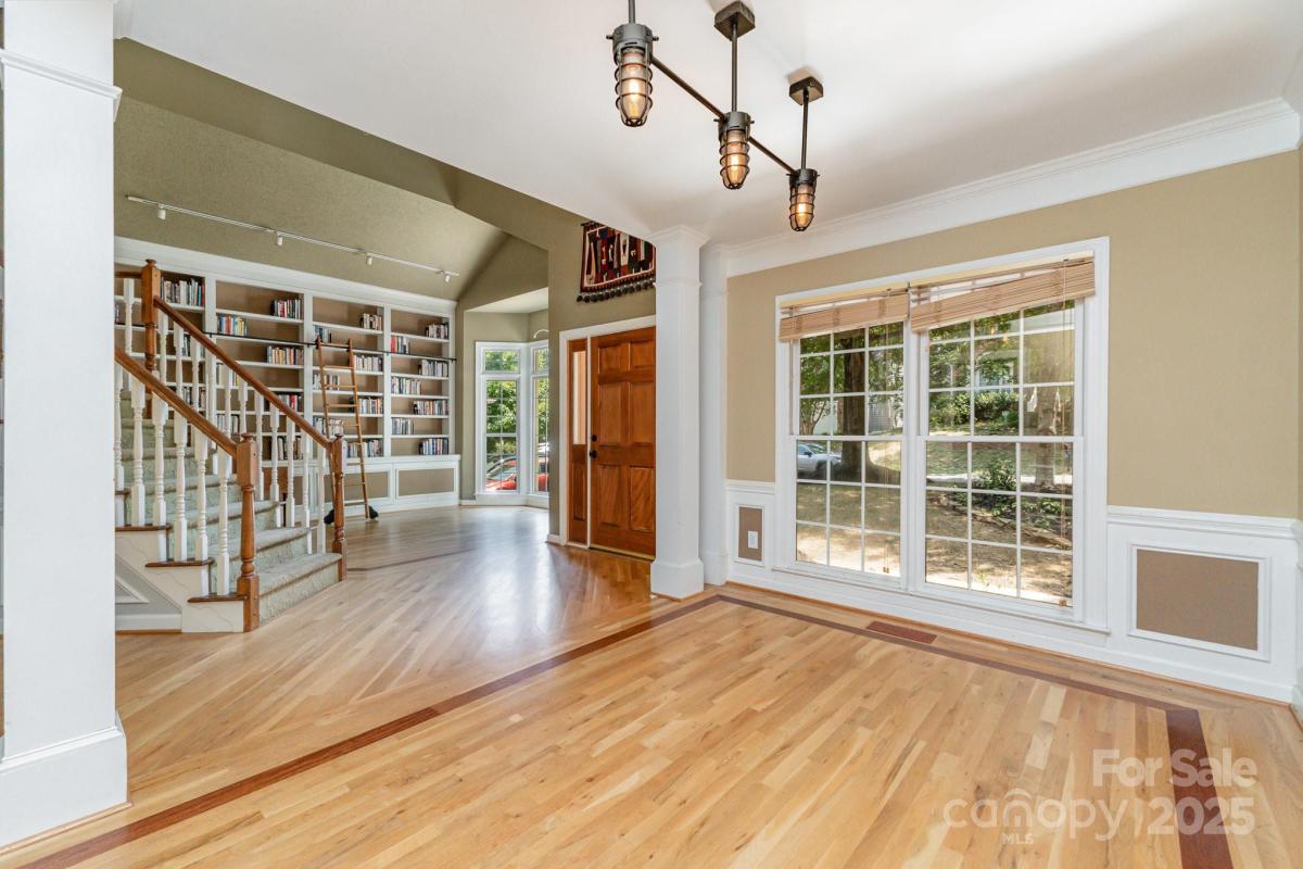 Stunning 4-bedroom, 2.5-bathroom home nestled in a quiet neighborhood. This spacious property features over 2,700 square feet of well-designed living space. Step inside and you're greeted by gleaming hardwood floors detailed wainscoting, and soaring ceilings. The grand foyer opens to a light-filled formal library with custom-built-in bookshelves and oversized bay windows. The open-concept kitchen boasts granite countertops, stainless steel appliances, and modern pendant lighting, perfect for entertaining. The main level also includes a beautiful sunroom with wood-paneled ceilings and walls of sliding glass doors. The spacious primary suite features a tray ceiling and a custom barn door leading into the luxurious en-suite bath with dual vanities, a soaking tub a walk-in shower, and a generous walk-in closet. Upstairs, you'll find an additional 3 bedrooms plus a bonus room with ample space and storage. Step outside onto the private back deck and enjoy serene views of the wooded backyard.