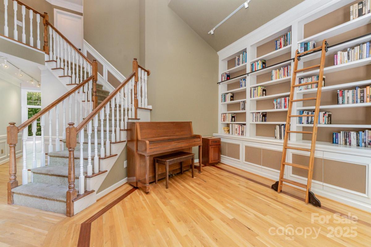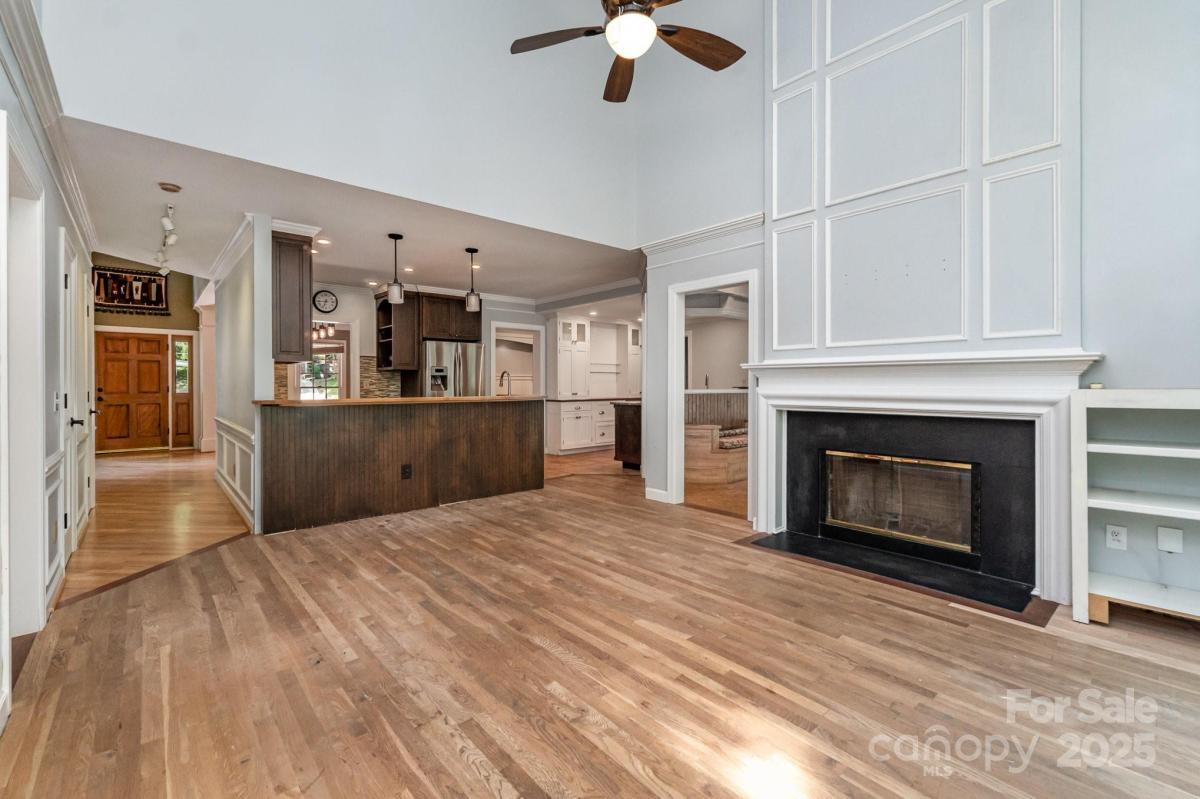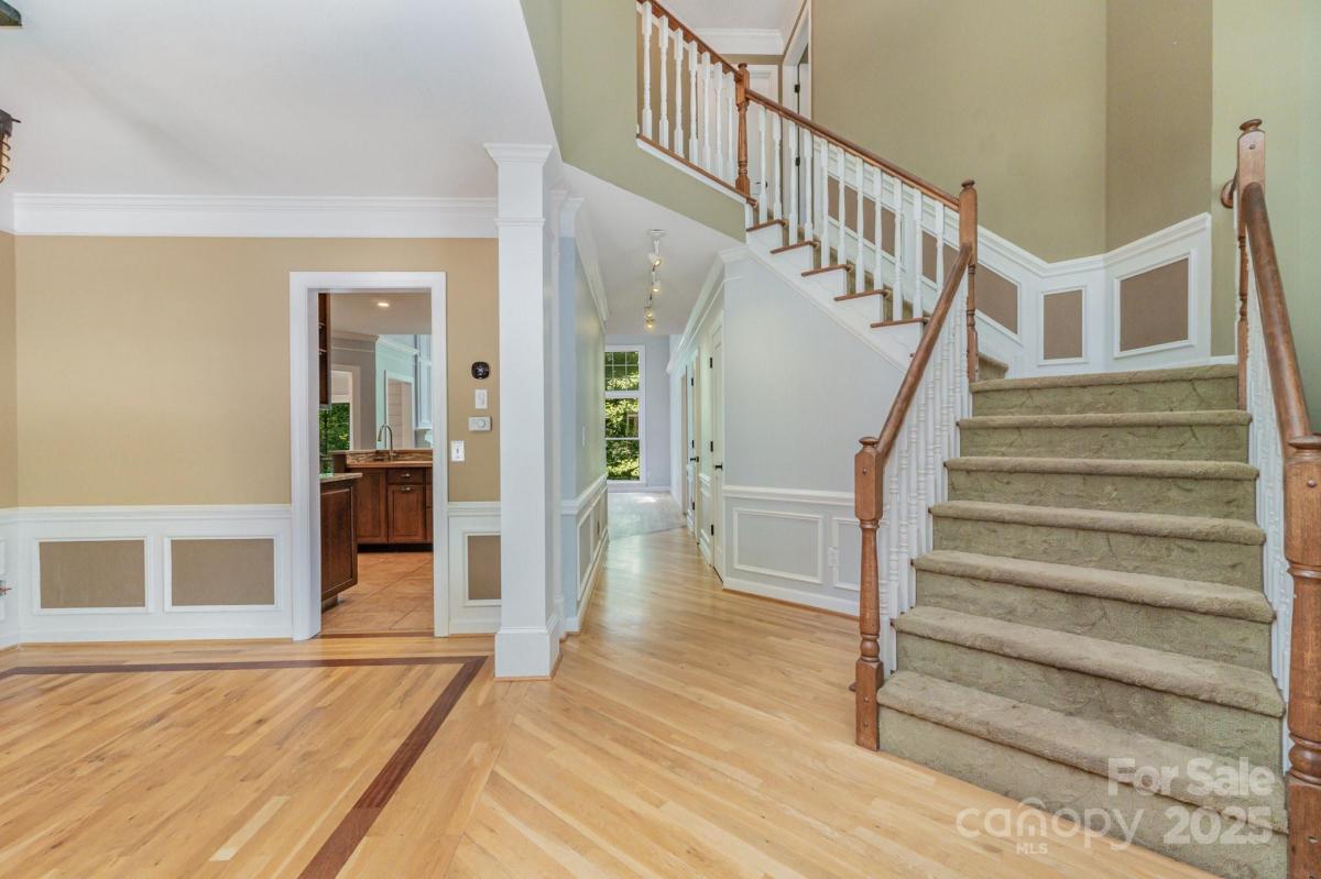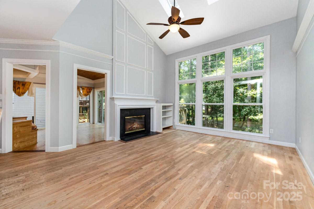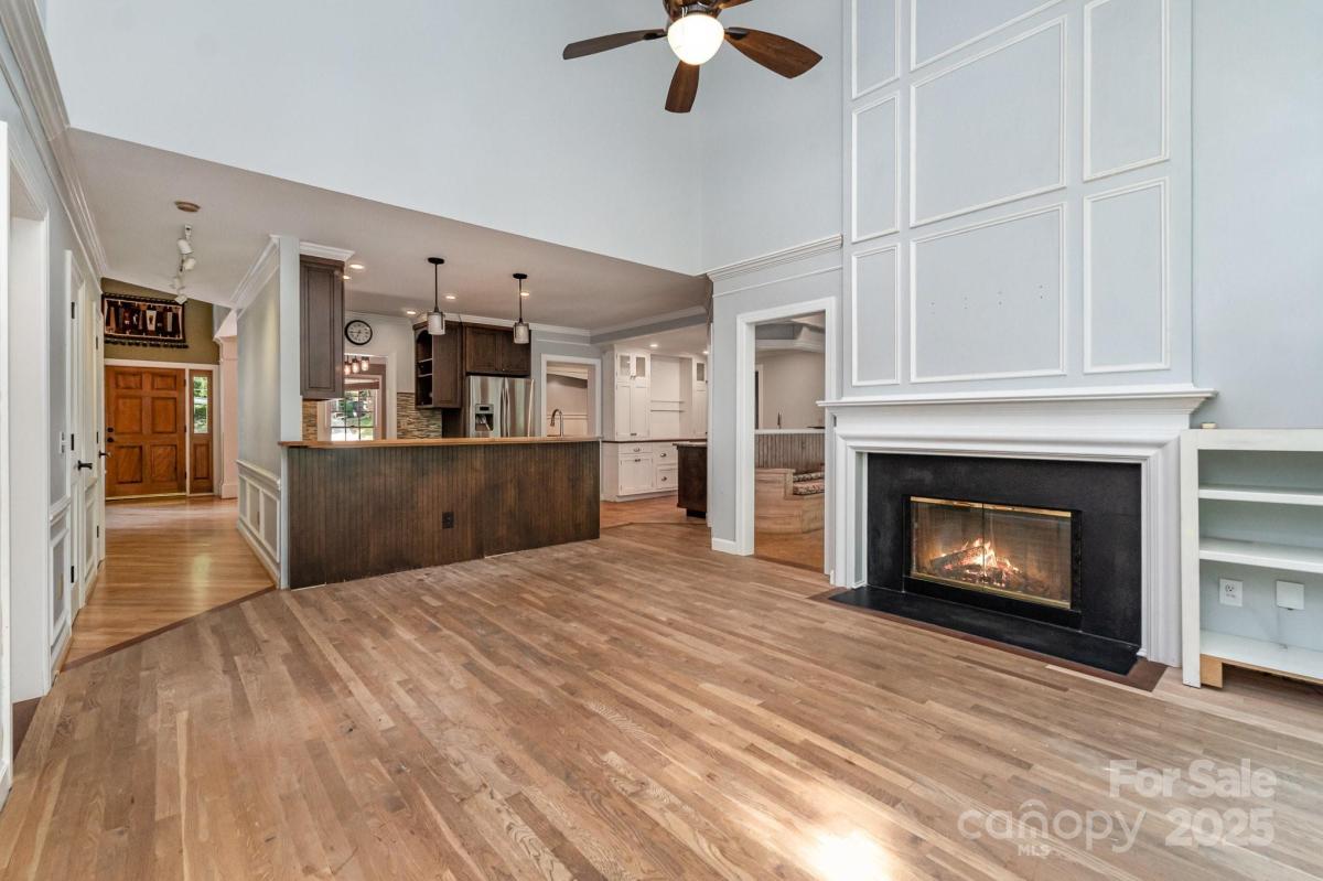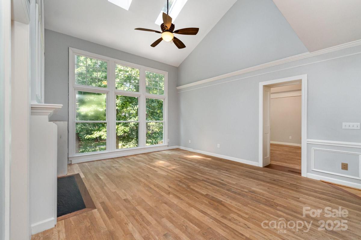 Stunning 4-bedroom, 2.5-bathroom home nestled in a quiet neighborhood. This spacious property features over 2,700 square feet of well-designed living space. Step inside and you're greeted by gleaming hardwood floors detailed wainscoting, and soaring ceilings. The grand foyer opens to a light-filled formal library with custom-built-in bookshelves and oversized bay windows. The open-concept kitchen boasts granite countertops, stainless steel appliances, and modern pendant lighting, perfect for entertaining. The main level also includes a beautiful sunroom with wood-paneled ceilings and walls of sliding glass doors. The spacious primary suite features a tray ceiling and a custom barn door leading into the luxurious en-suite bath with dual vanities, a soaking tub a walk-in shower, and a generous walk-in closet. Upstairs, you'll find an additional 3 bedrooms plus a bonus room with ample space and storage. Step outside onto the private back deck and enjoy serene views of the wooded backyard.