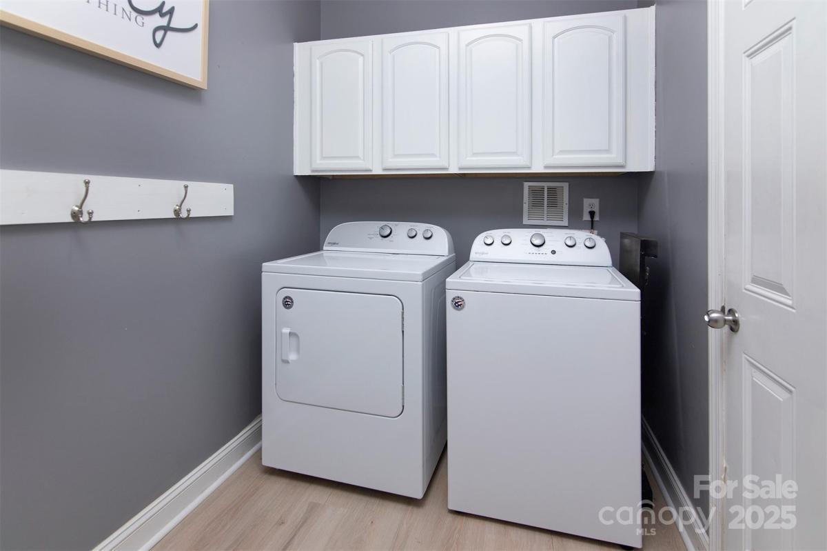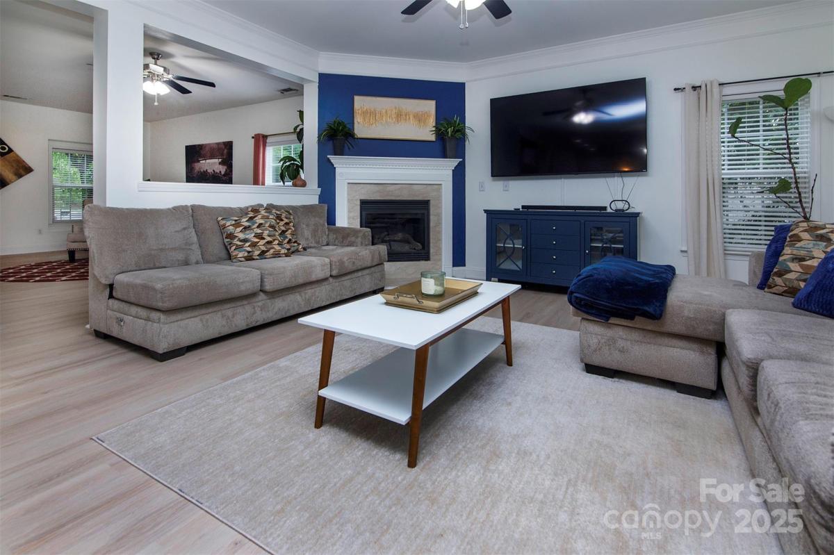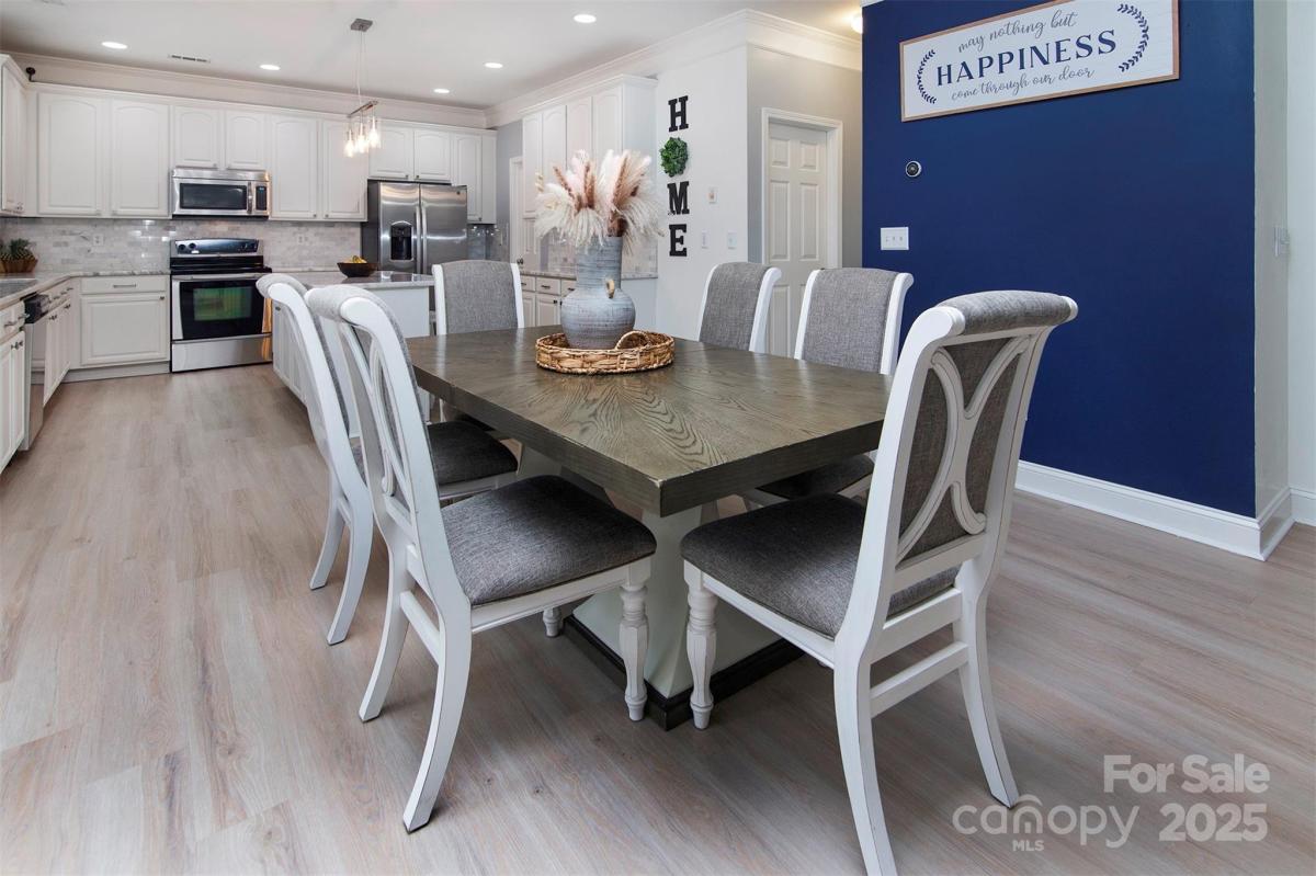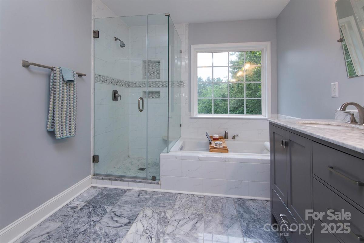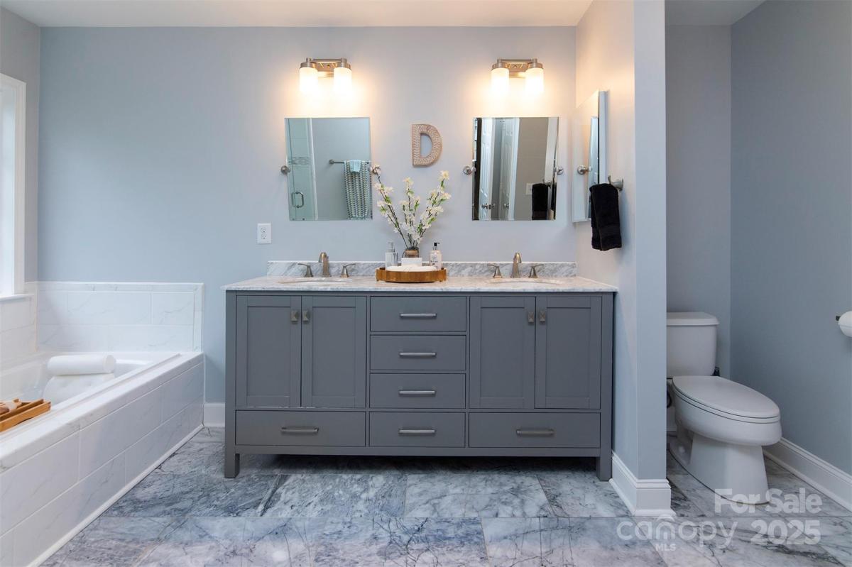 This beautifully updated home features luxury vinyl plank flooring throughout the open-concept main level, creating a seamless flow between living, dining, and kitchen spaces. The spacious kitchen includes marble countertops, a large island with breakfast bar, a fridge that conveys, and a walk-in pantry—offering both style and functionality. Upstairs, the generous primary suite boasts two walk-in closets and a spa-inspired bathroom complete with a marble-topped dual-sink vanity, frameless glass shower, and soaking tub. The fully fenced backyard offers plenty of space and privacy, with ample room to relax or entertain around the fire pit. Ceiling speakers are installed throughout the home, including outdoor areas, for a cohesive audio experience inside and out. Modern updates and thoughtful design make this home an exceptional choice.