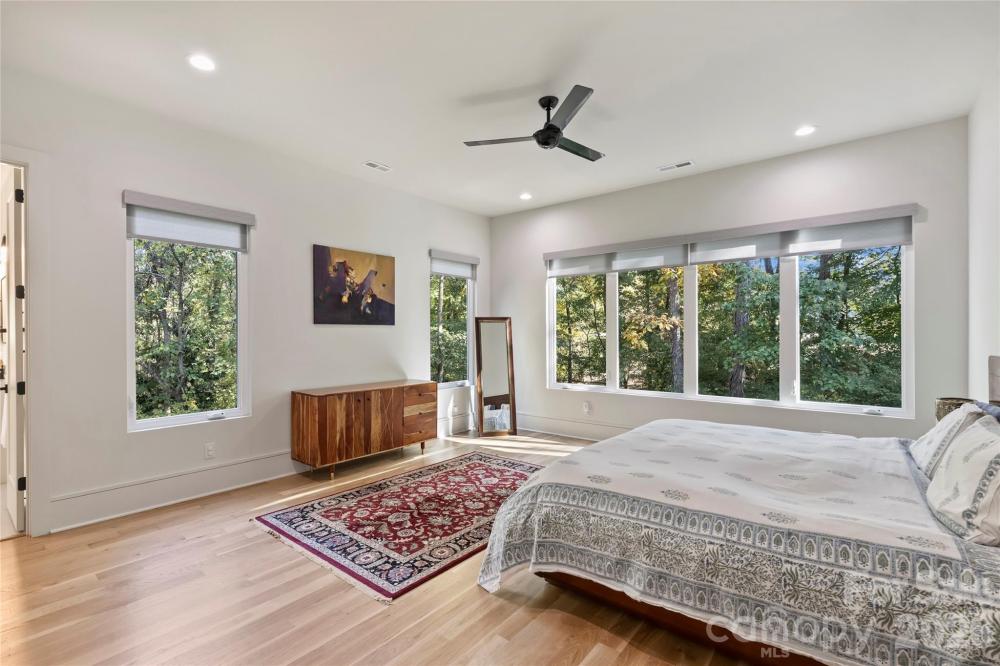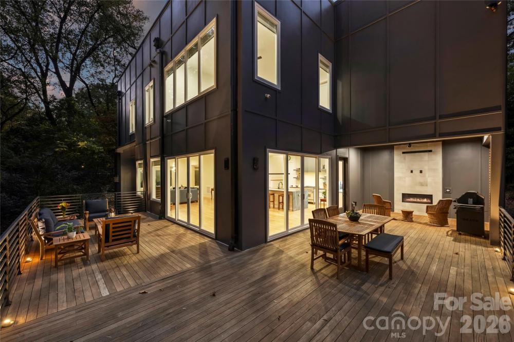 Modern sophistication and luxury abound in a lovely wooded setting in popular Stonehaven! Flooded with natural light, beautiful architectural features and high end finishes throughout, this home is designed to delight. The open floor plan is optimal for entertaining or simply relaxing at home. Wooded views of the half acre lot provide serenity whether you are inside or enjoying the Ipe wood wrap-around deck. The chef's kitchen has it all: built in Sub-Zero fridge, ZLINE gas range with hood, Bosch dishwasher, Sharp microwave drawer, and dual temperature controlled wine fridges! The dramatic center island with waterfall countertop provides a perfect spot to unwind. Two walls of sliding glass doors open to the deck. Thoughtful SMART home systems control heating and cooling, fireplaces, garage door, irrigation system, Sub-Zero fridge, electric vehicle charger, and high end security system! Follow the blonde white oak flooring upstairs to a luxurious primary suite boasting a huge bedroom overlooking the woods and 2 custom closets, spa-like bath with zero entry shower featuring rain shower head and hand shower, dual vanity with quartz countertop, and soaking tub. 3 additional bedrooms with custom closets and 2 full baths with beautiful tile and countertops complete this level. The upper level includes a cozy reading nook and spacious bonus room which may serve as the 5th bedroom with its own full bath. Don't miss evenings grilling out on the deck, enjoying the outdoor fireplace and scenic setting any time of year. Great location with unbeatable proximity to James Boyce Park, Sardis Swim and Racquet Club, and the McAlpine Creek Greenway. What a lifestyle! Close proximity to several private schools. Welcome home!