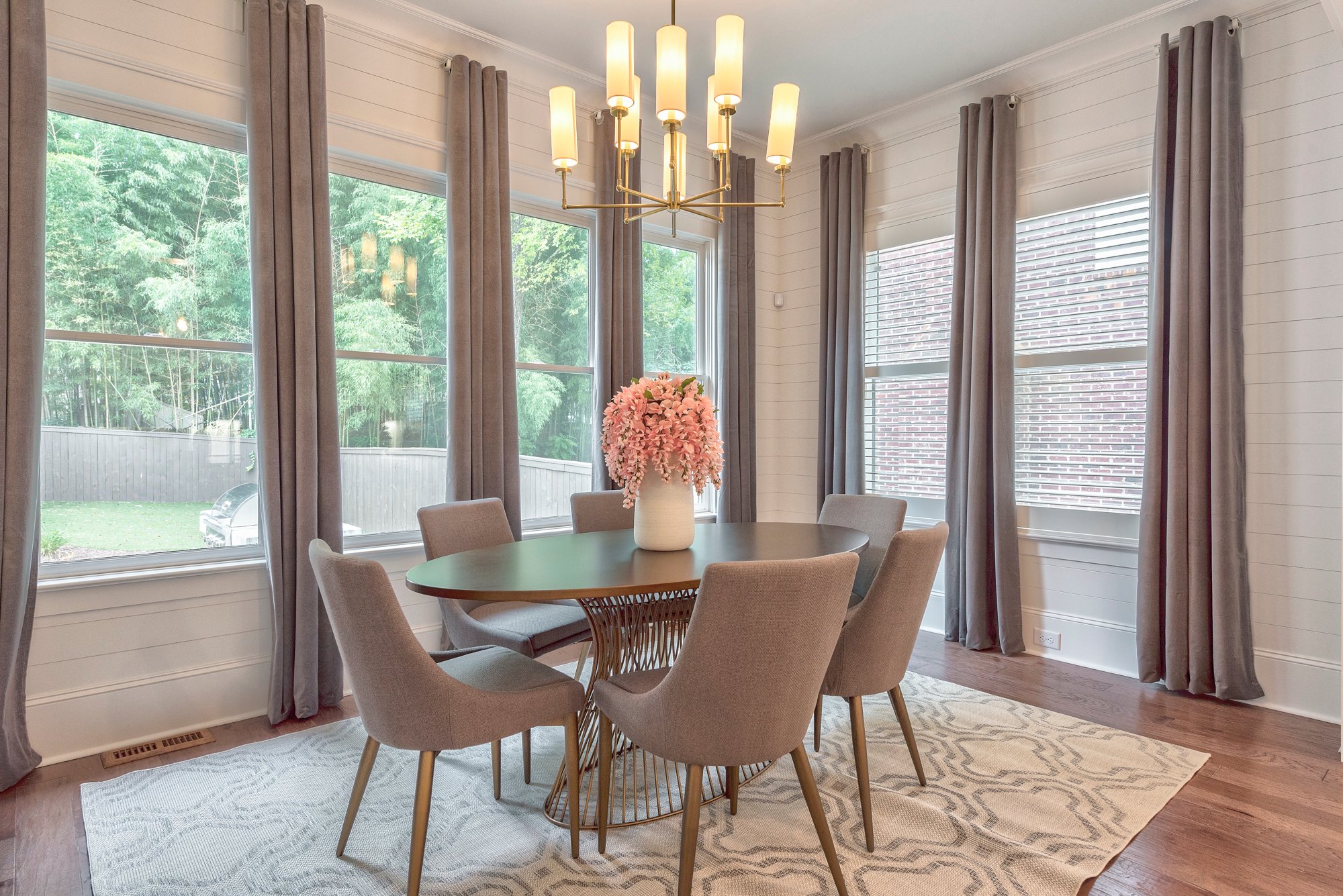 Nearby is a handy pantry. This wonderful kitchen flows effortlessly into the spacious dining area surrounded by windows and shiplap accent walls.
