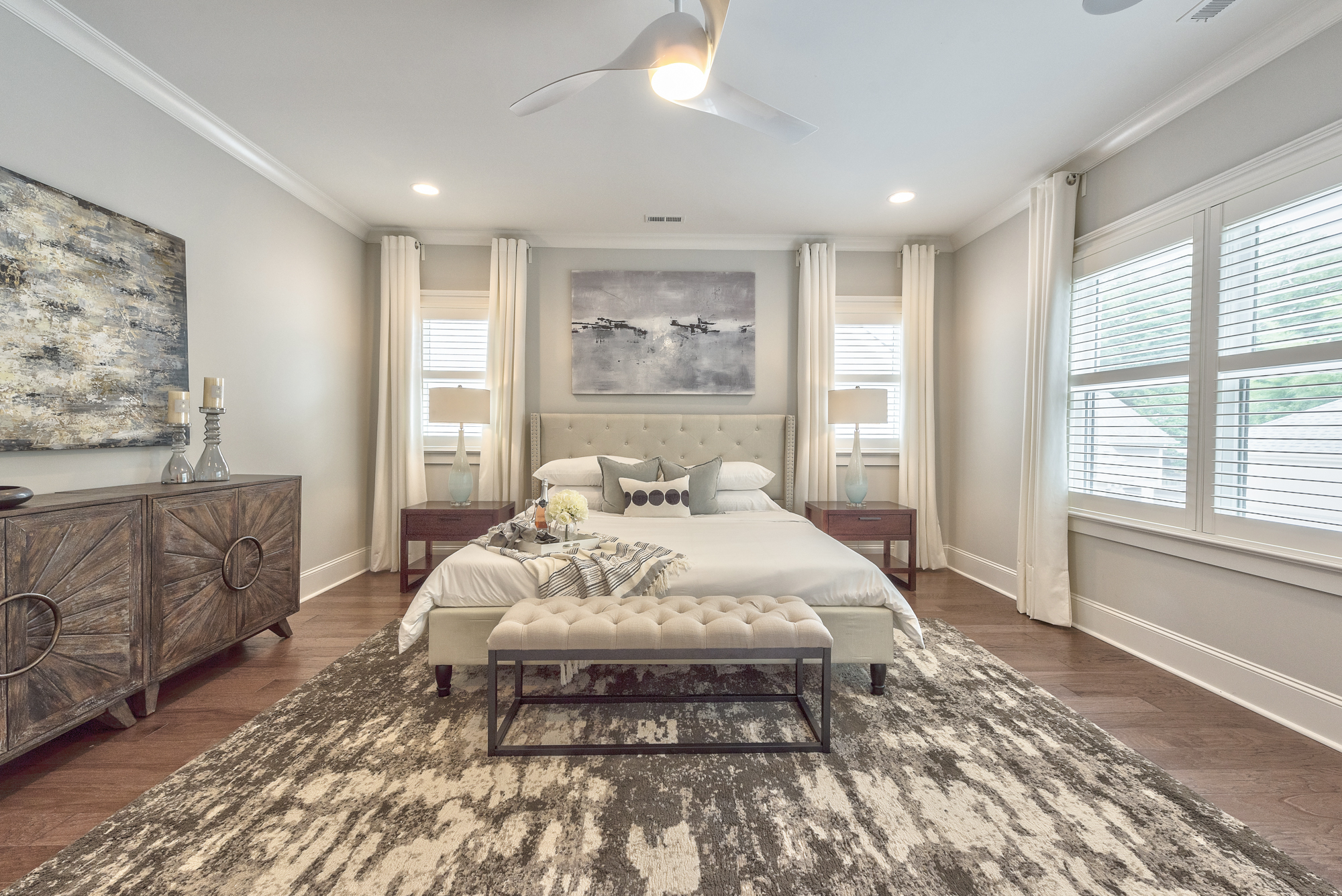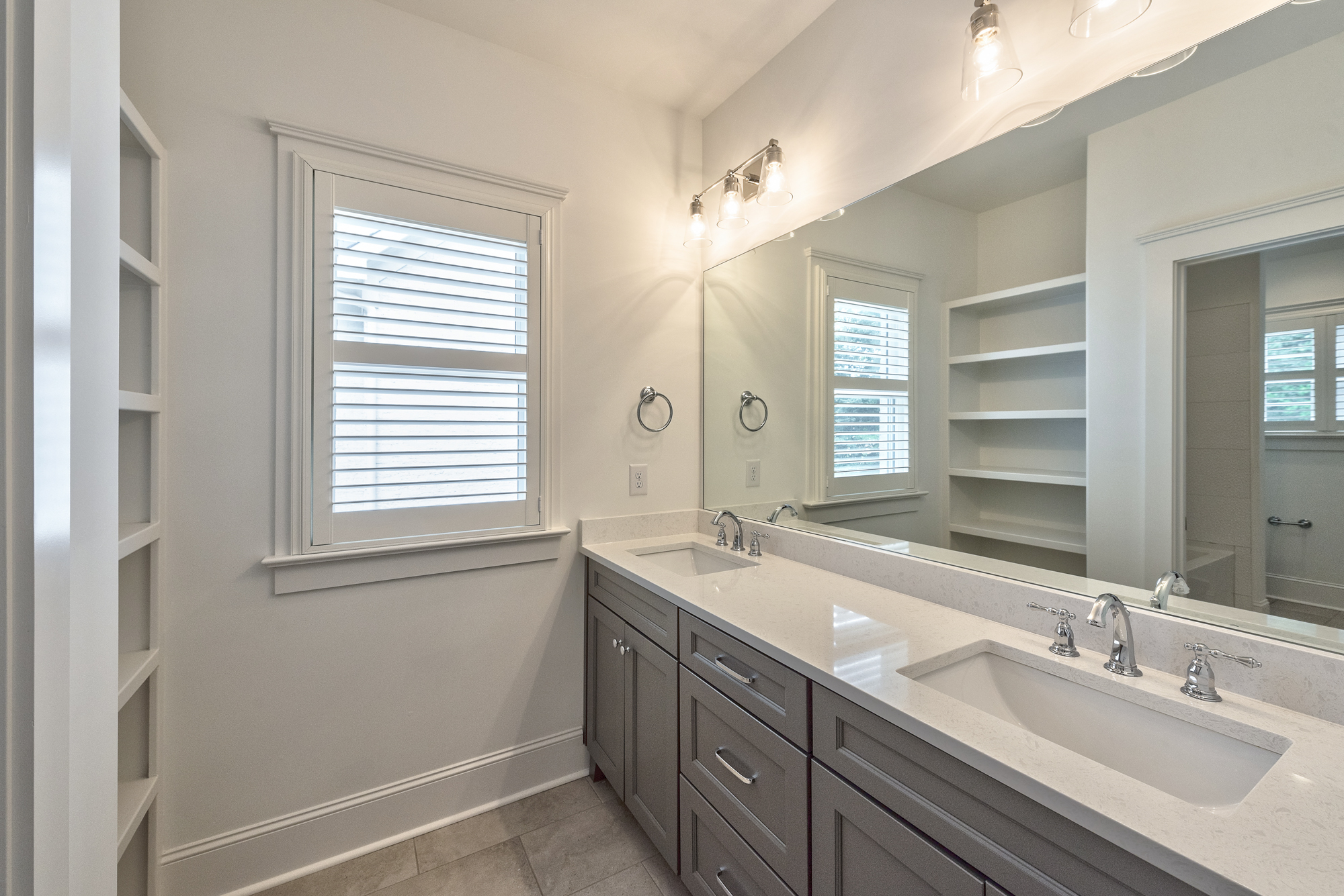 The second floor hosts the Owner’s Suite offering a luxurious bath with two separate quartz vanities, free-standing soaking tub plus a large shower with two shower heads and a spacious walk-in closet with custom wood shelving.