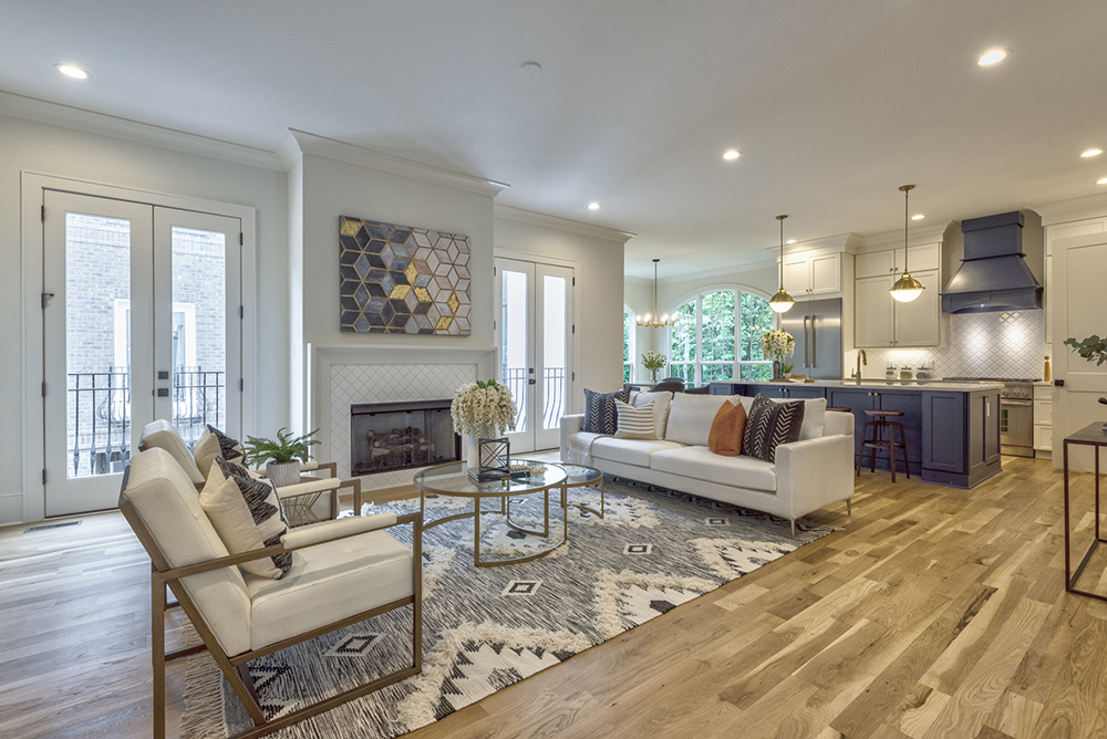Description: This is one of 5 homes fronting Whiting Ave; 4 homes front on Charles Ave (Phase 1 – sold) and 5 homes that front the common green where you can play fetch with Max. This plan features an open living level with breakfast nook, dining area, great room with distressed wood accent TV wall, kitchen with large eat-at island, pop-up outlets, tile backsplash, black stainless appliances (including gas range) and matching butler’s pantry with wine fridge, PLUS walk-in pantry. The living area opens via 3-panel slider onto a large balcony off with a streetscape view, custom metal railing. As well as a first floor bedroom suite perfect for guests, roommates or a home office; and a 3rd floor master with 12′ vaulted ceilings with distressed wood accent, oversized walk-in closet, stunning glass enclosed shower & freestanding tub, dual vanity and water closet.